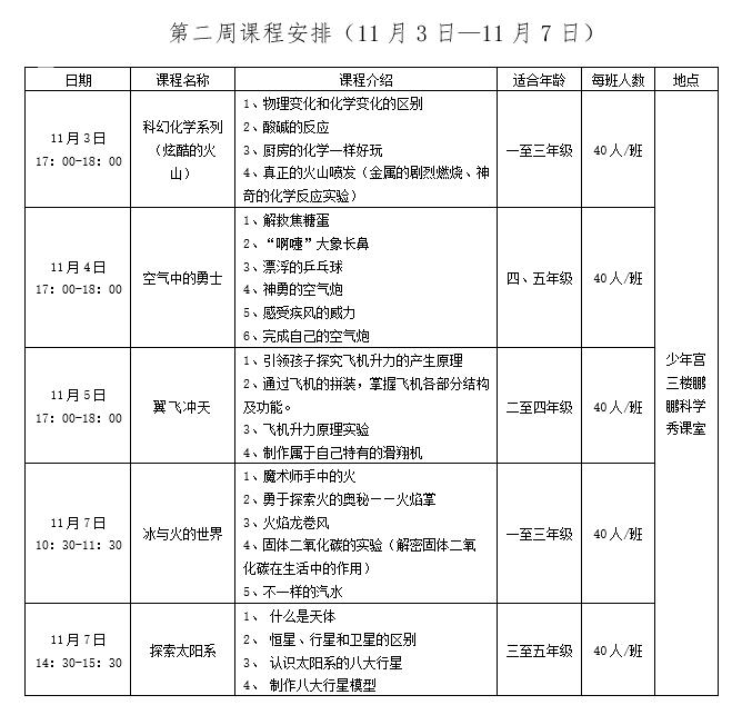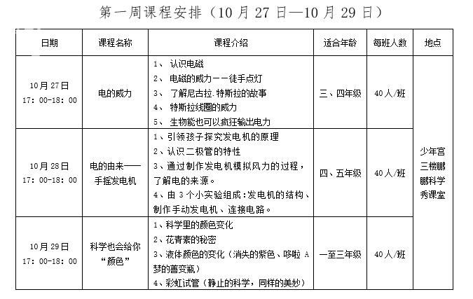 “鹏鹏科学秀——课后科学体验”活动作为该计划的重要内容之一,即将与广大家长和小朋友们见面啦! 该活动将邀请科普教育专业人士为孩子们开展科学秀表演及教学活动,以丰富广大少年儿童的课后生活,增长科学知识、激发科学兴趣。从10月27日开始至12月底,共将推出45次公益课程(每次1小时),全部课程均免费,现接受广大少年儿童预约。