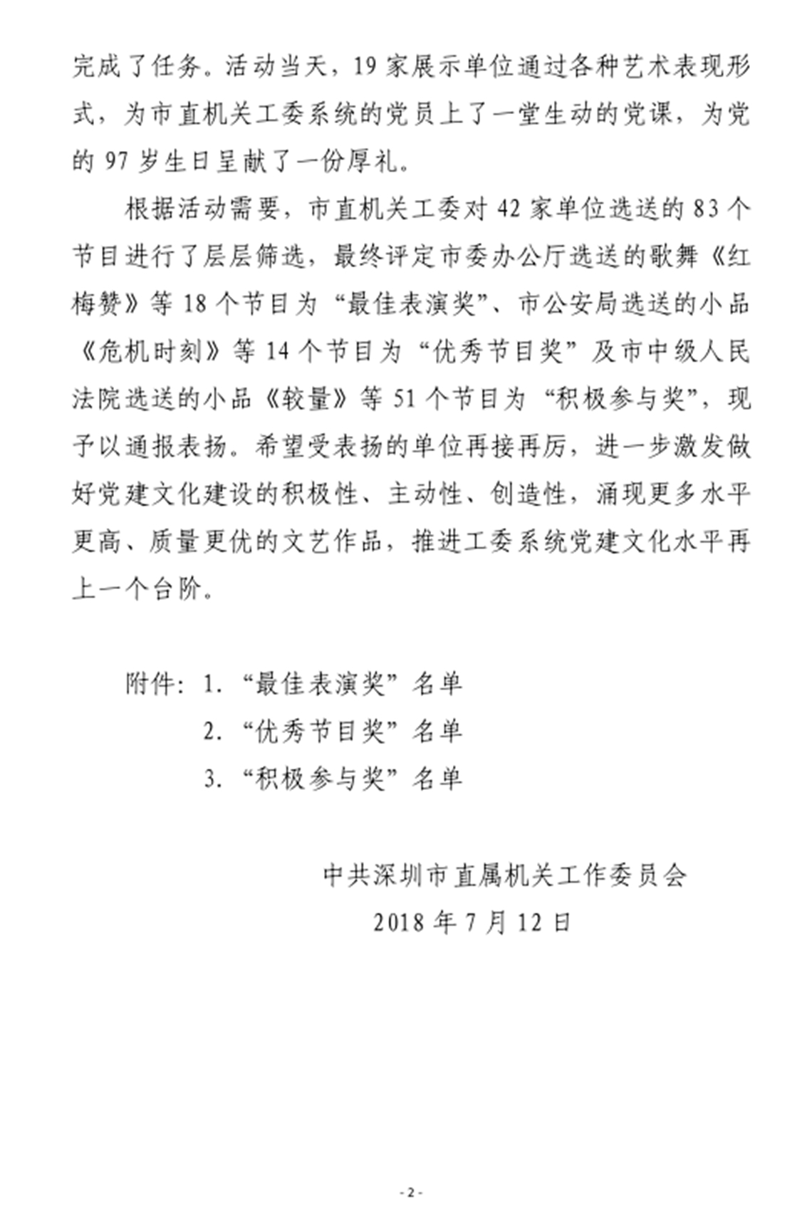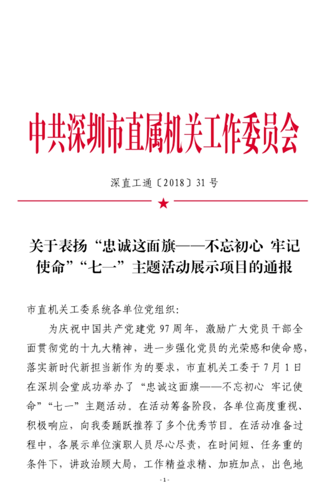 市直机关工委于7月1日在深圳会堂成功举办了“忠诚这面旗——不忘初心 牢记使命”“七一”主题活动。根据活动需要,对42家单位选送的83个节目进行了层层筛选,团市委选送的节目,由少年宫支部贾晓军同志表演的诗朗诵《有一种怀念叫永远》,被评定为“积极参与奖”,获得通报表扬。