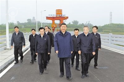 5月14日上午,中共中央总书记、国家主席、中央军委主席习近平在河南省南阳市主持召开推进南水北调后续工程高质量发展座谈会并发表重要讲话。这是座谈会前,习近平于13日在南阳市淅川县陶岔渠首枢纽工程考察。