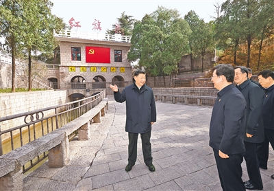 28日上午,习近平来到河南安阳林州市红旗渠纪念馆。上世纪60年代,当地人民为解决靠天等雨的恶劣生存环境,在党和政府支持下,在太行山腰修建了引漳入林水利工程,被称为“人工天河”。习近平走进展馆,依次参观了“千年旱魔,世代抗争”、“红旗引领,创造奇迹”、“英雄人民,太行丰碑”、“山河巨变,实现梦想”、“继往开来,精神永恒”等展览内容。习近平指出,红旗渠就是纪念碑,记载了林县人不认命、不服输、敢于战天斗地的英雄气概。要用红旗渠精神教育人民特别是广大青少年,社会主义是拼出来、干出来、拿命换来的,不仅过去如此,新时代也是如此。没有老一辈人拼命地干,没有他们付出的鲜血乃至生命,就没有今天的幸福生活,我们要永远铭记他们。今天,物质生活大为改善,但愚公移山、艰苦奋斗的精神不能变。红旗渠很有教育意义,大家都应该来看看。随后,习近平实地察看红旗渠分水闸运行情况,详细了解分水闸在调水、灌溉、改善生态环境等方面的重要作用。
