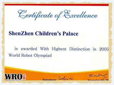 2005年11月,在泰国曼谷举行的“2005年第二届世界机器人奥林匹克竞赛(WRO)”中,由深圳市少年宫(深圳市少年科学院)组建的机器人代表队,在来自世界各地122个代表队的激烈角逐中脱颖而出,获得大赛颁发的“最高荣誉奖”。
