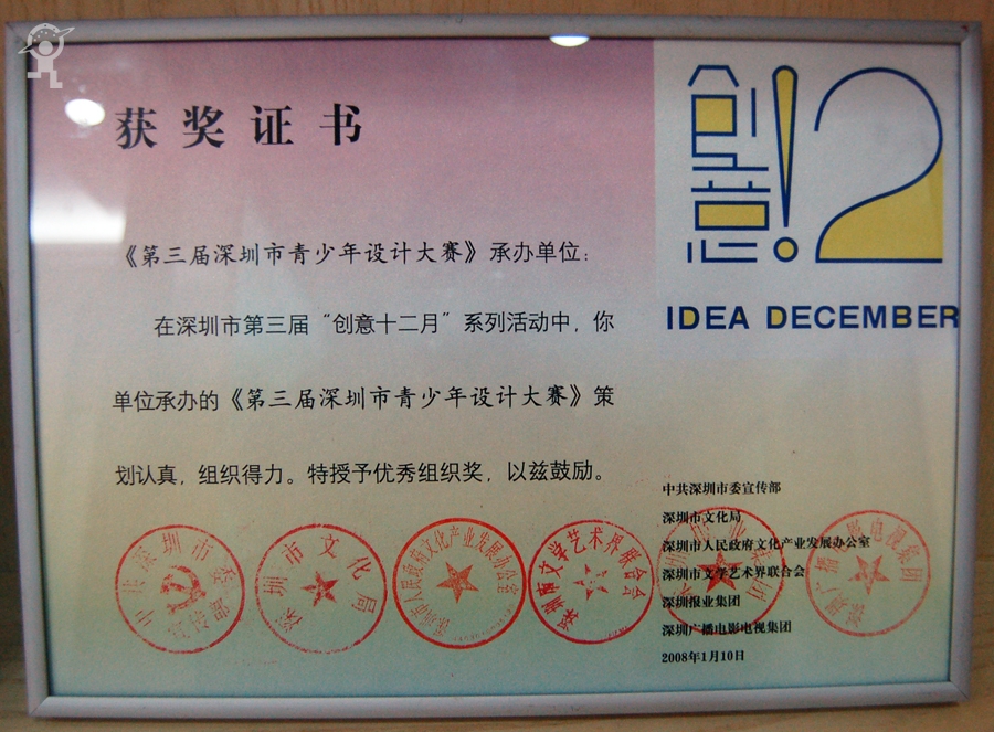 2008年1月在深圳市第三届“创意十二月”系列活动中,承办第三届深圳市青少年设计大赛,荣获“优秀组织奖” 2008年01月02日 2008年1月在深圳市第三届“创意十二月”系列活动中,承办第三届深圳市青少年设计大赛,荣获“优秀组织奖”