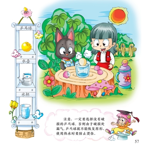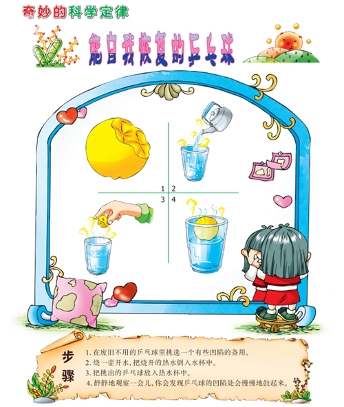 原理:乒乓球泡在热水中时,球内的气体发生了膨胀,推动球壁向外,使乒乓球恢复原形。这是利用了物体热胀冷缩的性质。