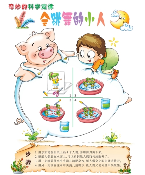 原理:肥皂会使水的表面张力变小,当滴入水中央后,纸人偶会被盆边上表面张力较大的水拉过去;而糖会使水的表面张力变大,所以滴入糖后,水会再次把纸人偶拉回来。