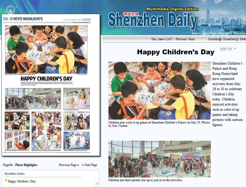 Shenzhen Children’s Palace and Hong Kong Disneyland have organized activities from May 28 to 30 to celebrate Children’s Day today. Children enjoyed activities such as color-it-up games and taking pictures with cartoon figures.