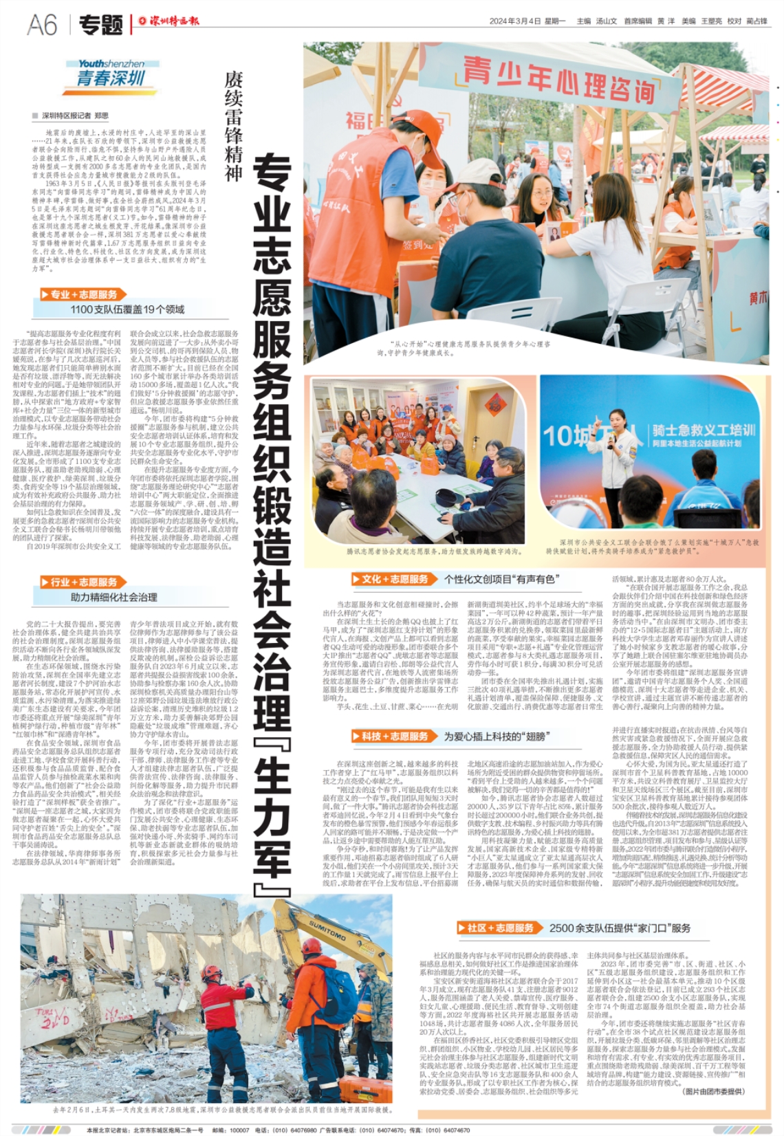 3月4日,《深圳特区报》发布整版报道《专业志愿服务组织锻造社会治理“生力军”》,讲述了深圳志愿者以爱心奉献续写雷锋精神新时代篇章,并在深圳组织一支日益壮大的“生力军”。