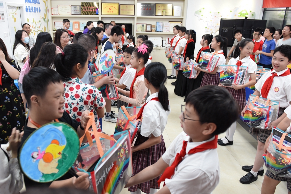 活动组织少先队员与星星的孩子手拉手赠送学习礼包,与社会共同关爱自闭症特殊儿童的健康成长。