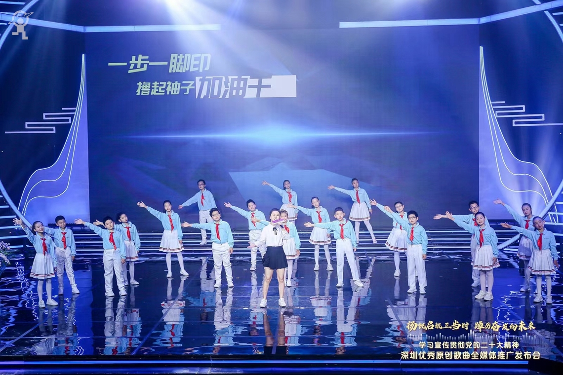 ▲深圳市少年宫合唱团在学习宣传贯彻党的二十大精神深圳优秀原创歌曲全媒体推广发布会上唱响《奔跑吧,湾区少年》
