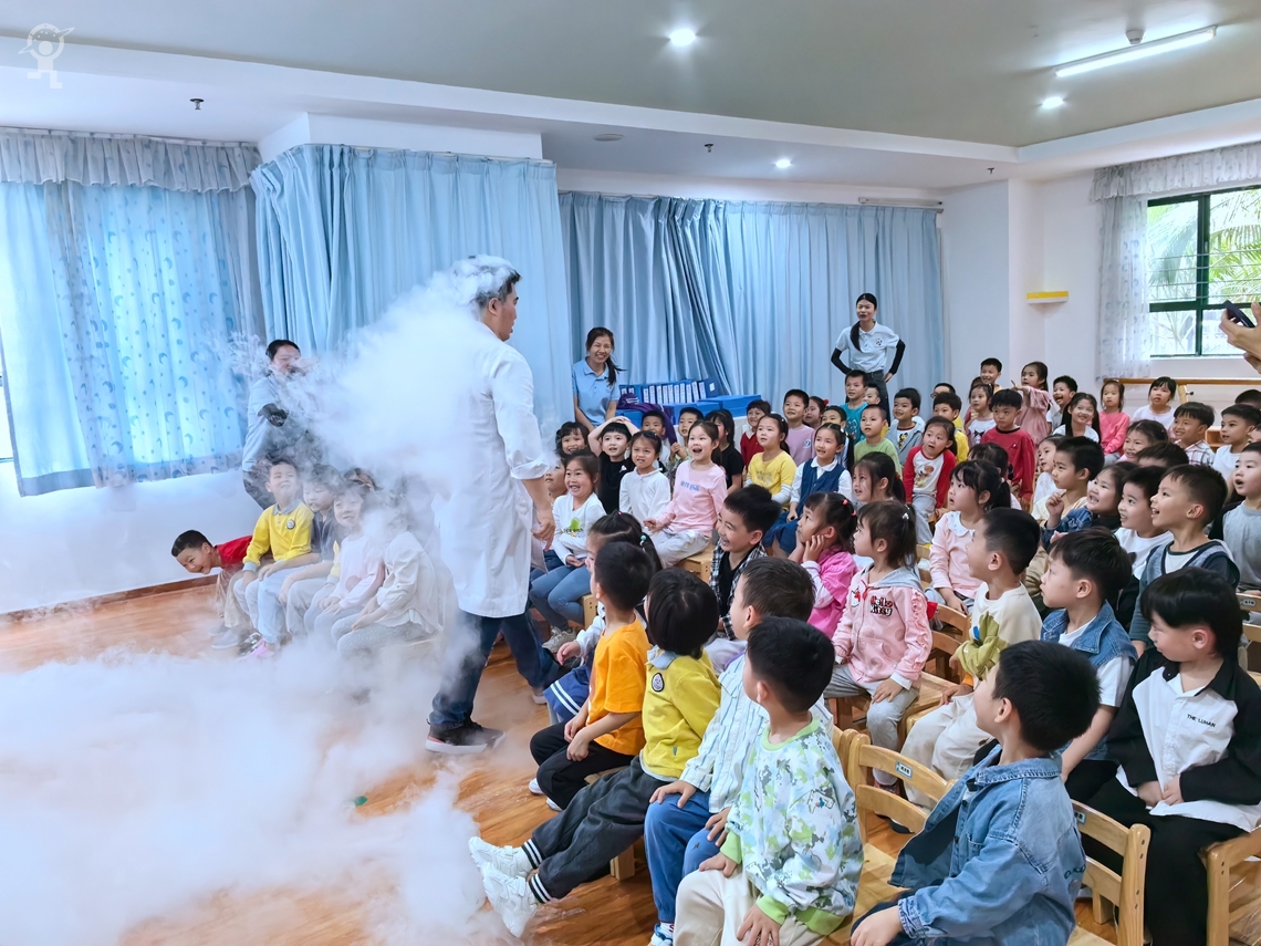 ▲鹏鹏科学秀的老师头顶“冒烟”,生动地给孩子们展示了“干冰升华”现象
