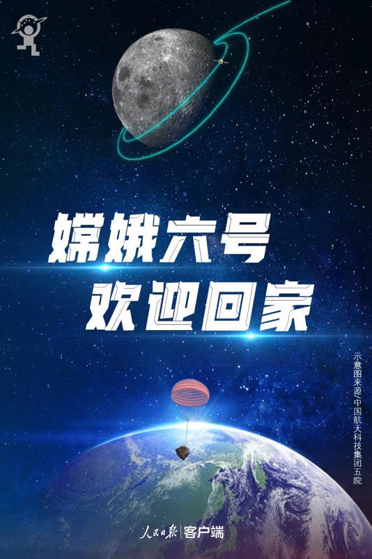 嫦娥六号探测器于5月3日在中国文昌航天发射场发射升空并进入地月转移轨道。探测器经过轨道修正、近月制动,顺利进入环月轨道飞行。此后,探测器经历着陆器和上升器组合体、轨道器和返回器组合体的分离,在鹊桥二号中继星支持下,着陆器和上升器组合体实施环月降轨及动力下降,于6月2日精准着陆在月球背面南极-艾特肯盆地预选区域并开展采样工作。6月4日,上升器点火起飞、精准入轨,于6日完成与轨道器和返回器组合体之间的交会对接及样品转移,此后按计划与轨道器和返回器组合体分离并受控落月。此后,轨道器和返回器组合体经历了13天环月等待,此后在完成2次月地转移入射、1次轨道修正后,返回器于6月25日与轨道器分离并携带月背样品重返地球。