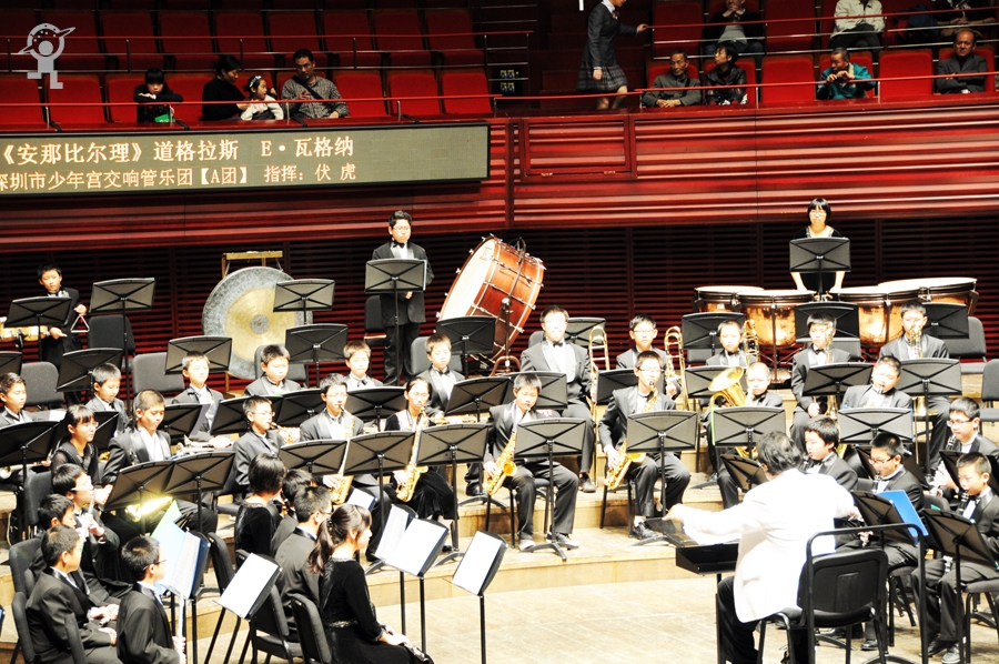 由深圳市教育协会、深圳市管乐协会主办的“2012深圳管乐艺术节暨第14届深圳市校际管乐节”于12月1日在深圳市信息学院拉开帷幕。来自全市44个管乐团队参加了展演与比赛,深圳市少年宫交响管乐团(A团)荣获金奖,指挥伏虎老师获得优秀指挥奖及创作奖。