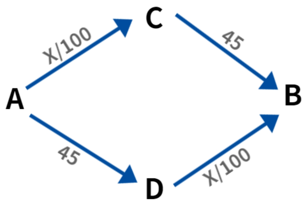 其中AD和CB的路况较好,无论有多少车辆驶过都只需要45分钟。但是AC和DB段正在修路,容易发生堵车,每增加X辆车,通行所需时长也会增加X/100分钟。