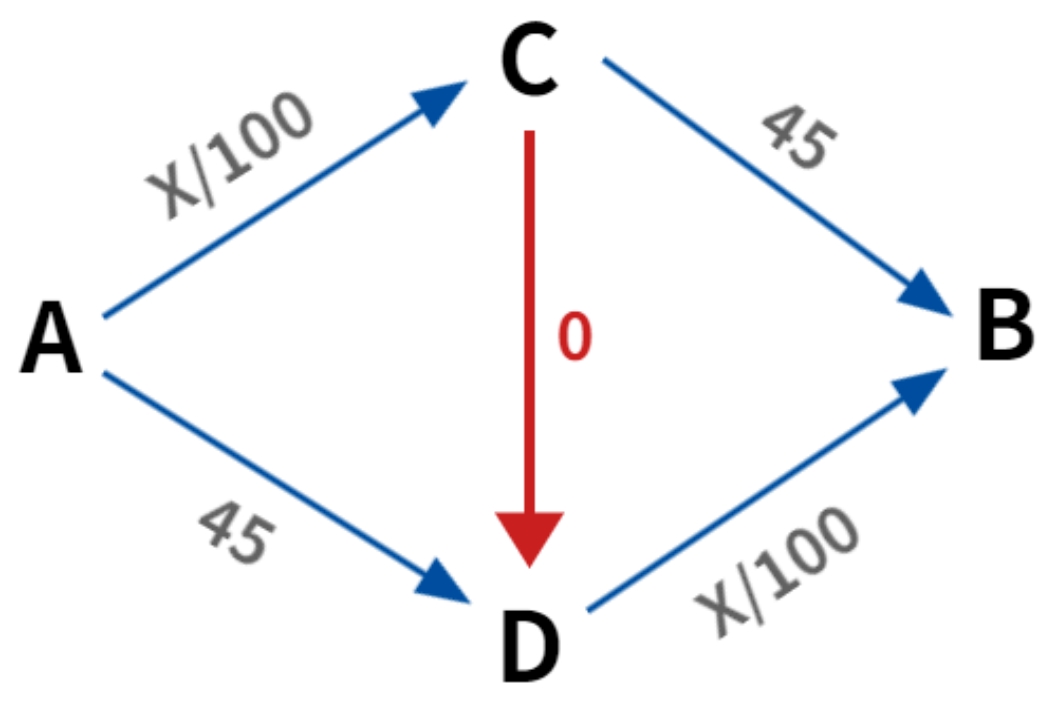 如上图所示,在AB之间新增一条快速通道,使得C与D连成一体。这条路畅通得“如飞一般的感觉”,所花时间几乎可以忽略不计,设为0。这对全体司机来说,无疑是件大好事,每一个人都能从这段新路中获得优势。