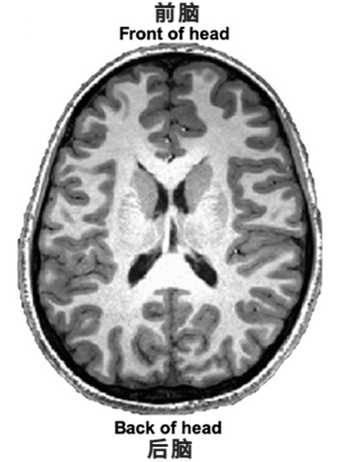 ▲利用磁共振成像技术获得的一张人脑图,围绕白色区域的灰色部分是大脑皮层的灰质, 白色区域则是白质。
