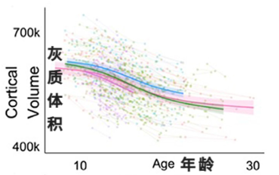 在青春期,灰质体积会随年龄增长逐渐减少约1.5%。灰质的减少被认为与脑细胞连接的微调有关,也与大脑中白质的增加有关。