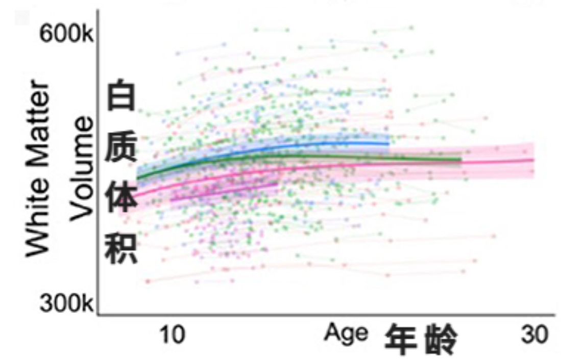 在青春期早期,白质逐渐增加,但到十多岁时,增长趋势趋于稳定。白质的增加被认为与脑细胞之间信号传递的速度增强有关。