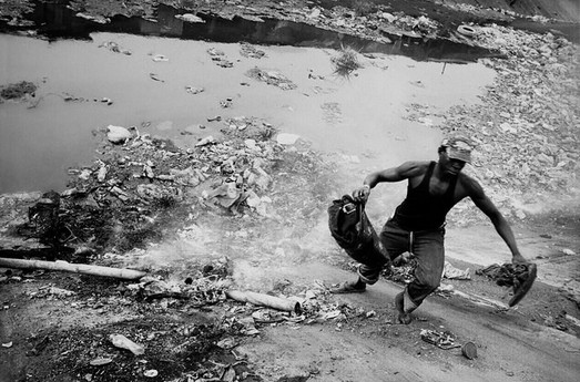 尼日利亚拉各斯市,奥拉迪波(Oladipo)电脑市场。电脑市场中废弃的零件都被倾倒进运河中,在运河水位 低的时候,拾荒者将垃圾从河中拖拽出来。由于这些都是有毒废弃物,使得运河边有许多燃烧着的火苗,回收充满危险 。