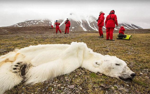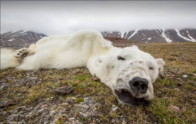 来自北极熊国际中心的伊恩·斯特林博士研究北冰洋区域的北极熊已有40余年。他断定这只北极熊死前肯定饱受饥饿的折磨。因为它的身上早已没有一点脂肪,瘦的只剩皮包骨头。而且其尸体距往年被拍到的地点约150英里(约241公里),由此可见,这只北极熊为了觅食,已经顾不是离家路途的遥远。