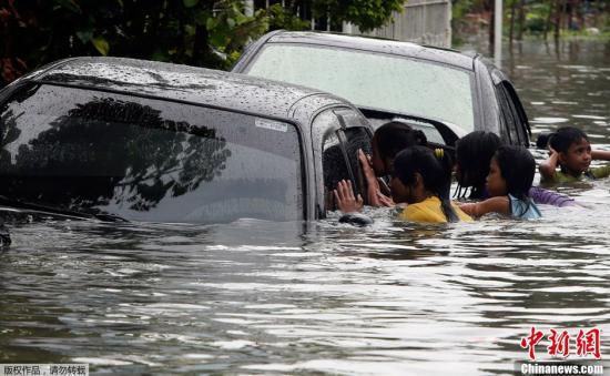 当地时间2013年8月19日,受热带风暴和西南季风的影响,菲律宾首都马尼拉及周边10个省普降大到暴雨,引发洪水