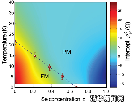 图2. Bi1.78Cr0.22(SexTe1-x)3 薄膜的磁性相图,揭示了随着Se含量的增加,在低温下存在着一个从铁磁态(FM)到顺磁态(PM)的磁性量子相变。