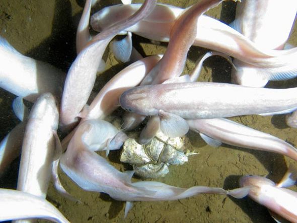照片拍摄于2010年,也就是海洋实验室发起的秘鲁-智利海沟考察期间,一群生活在海下3.7英里(约合5600米)的鳕鳗正在“进攻”一块诱饵。普莱德表示,虽然并不是一种新物种,但科学家此前从未见过一次“集结”如此多的深海鳕鳗。