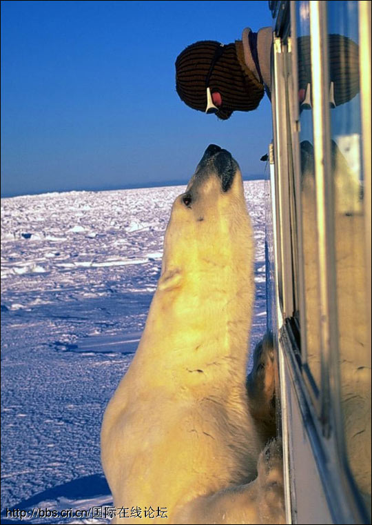 贝尔先生的北极车给了他难得的高度优势,但是北极熊却贴着车外侧站了起来。他说:“我们通常不会这么近距离拍摄北极熊,但是这一只例外。”