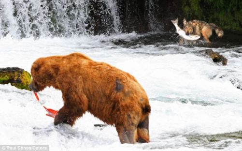 美摄影师拍下罕见狼学灰熊下河捕鱼情景